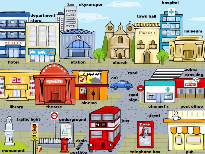 • city department store drain hospital hotel library monument museum post office postbox pub road road sign skyscraper station street telephone box theatre town hall traffic light underground zebra crossing