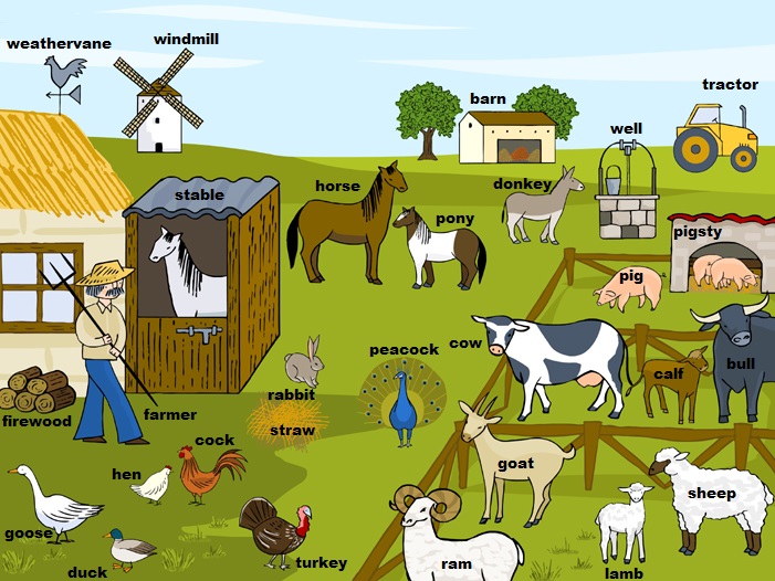 • farm cow donkey duck farm farmer firewood goat goose hen horse lamb peacock pig pigsty pony rabbit ram sheep stable straw tractor turkey weathervane well windmill