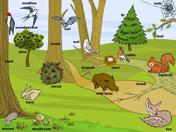 • forest fir forest fox hare leaf mouse mushroom nest owl pine robin shrub squirrel swallow track trunk web wild boar woodpecker