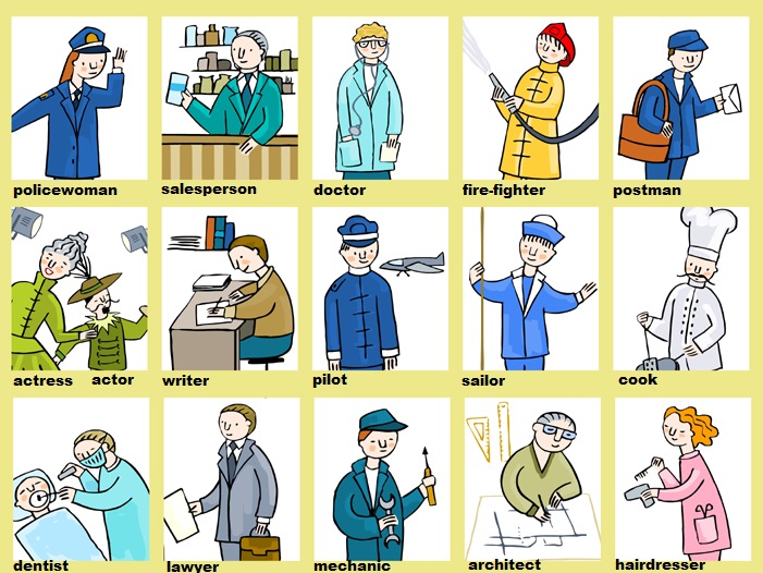 • job dentist doctor fire-fighter hairdresser job lawyer mechanic pilot policewoman postman sailor salesperson secretary tailor taxi driver vet waiter writer