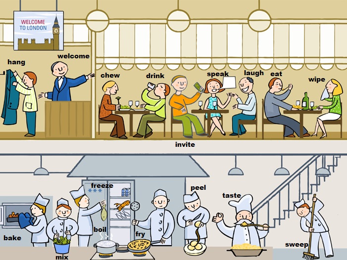 • restaurant drink eat freeze fry hang invite laugh laugh at mix peel restaurant speak sweep taste welcome wipe